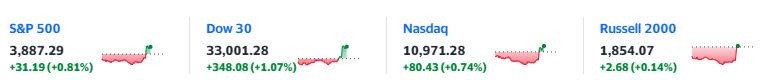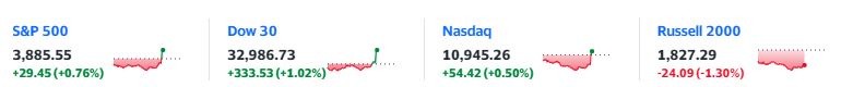標普 500 指數和納指追隨道指轉漲。道指漲幅擴大至逾 300 點或超 1%,標普漲 0.8%,納指漲 0.6%,羅素 2000 小盤股跌幅收窄至 1.3%。