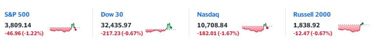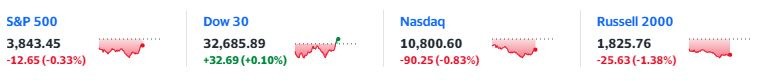 道指跌超 150 點後轉漲,標普 500 指數跌 0.6% 後跌幅砍半,科技股居多且對利率政策敏感的納指和納指 100 一度跌超 1%,羅素小盤股跌 1.4% 且跌幅相對最深。