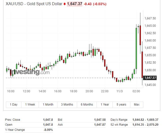 美元指數基本抹去日內跌幅,重回 111 上方。現貨黃金轉跌,失守 1650 美元,短線跳水 20 美元,此前一度上逼 1670 美元。