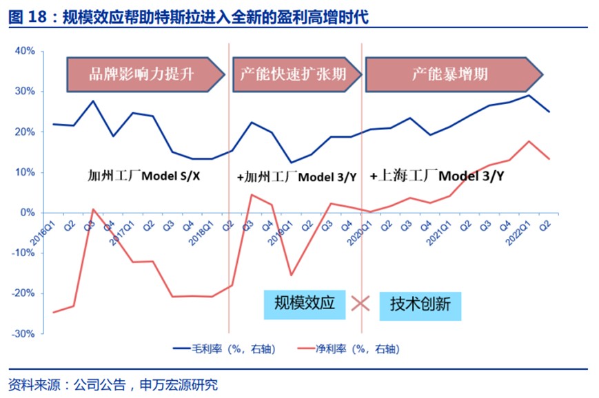 但事實上,特斯拉的利潤空間始終不是靜態的,歷史上,特斯拉自從進入產能擴張期之後,就已經迎來了毛利率的上升階段。