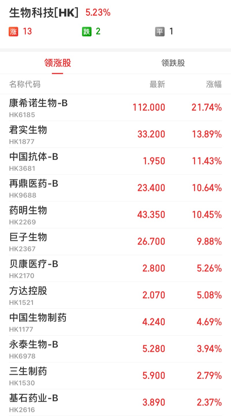 康希諾生物漲超 21%,君實生物漲超 13%,再鼎醫藥漲超 10%。