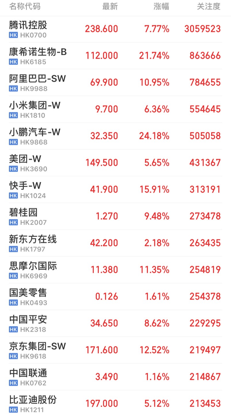 嗶哩嗶哩漲超 17%,快手漲近 16%,京東集團漲超 12%,阿里巴巴漲近 11%,騰訊漲超 7%。