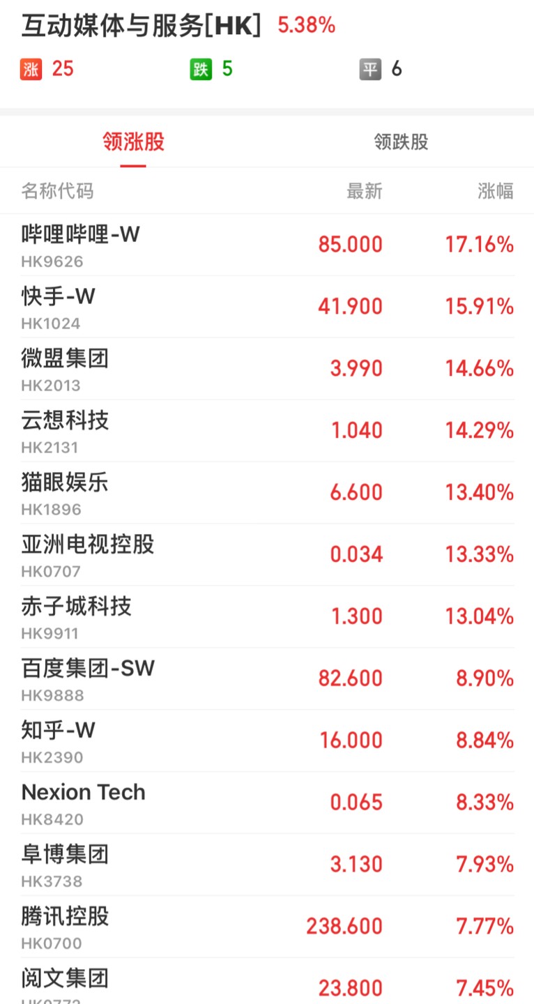 嗶哩嗶哩漲超 17%,快手漲超 15%,微盟集團漲超 14%,阜博集團漲超 7%,貓眼娛樂、知乎、阿里影業、閲文集團等跟漲。