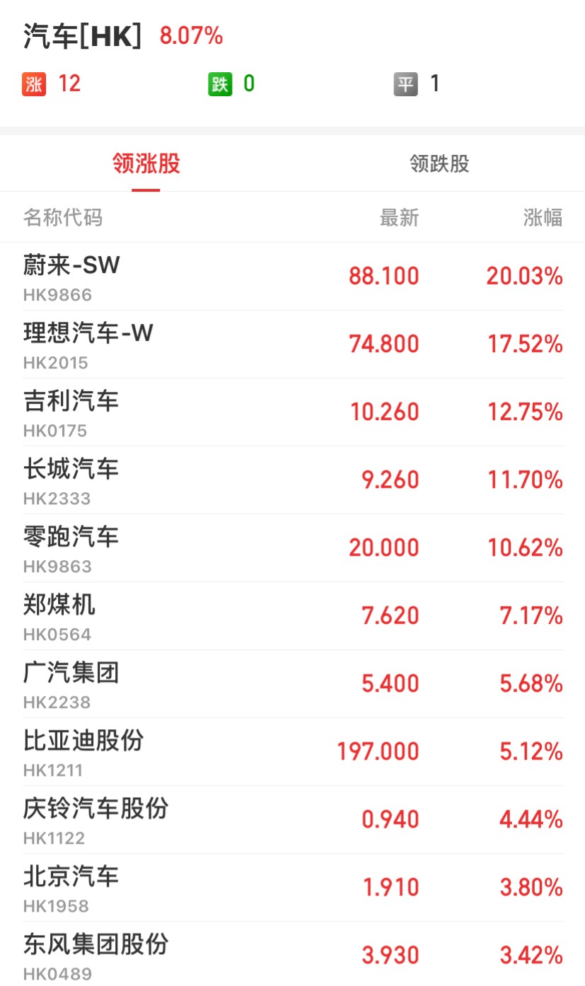 小鵬汽車漲超 24%,蔚來漲約 20%,理想汽車漲超 17%,長城汽車、吉利汽車、零跑汽車等跟漲。