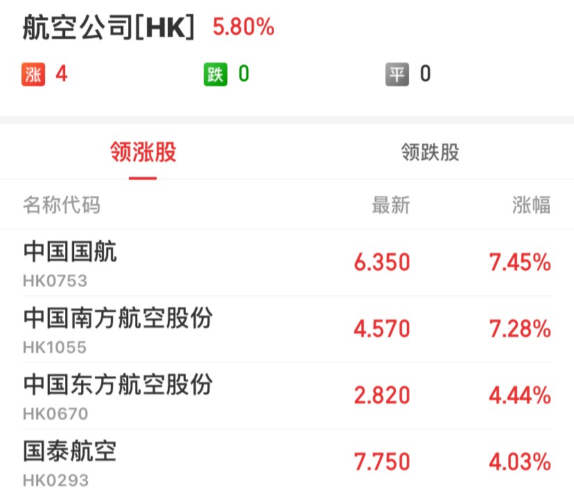 中國國航、中國南方航空股份漲超 7%,中國東方航空股份、國泰航空漲超 4%。