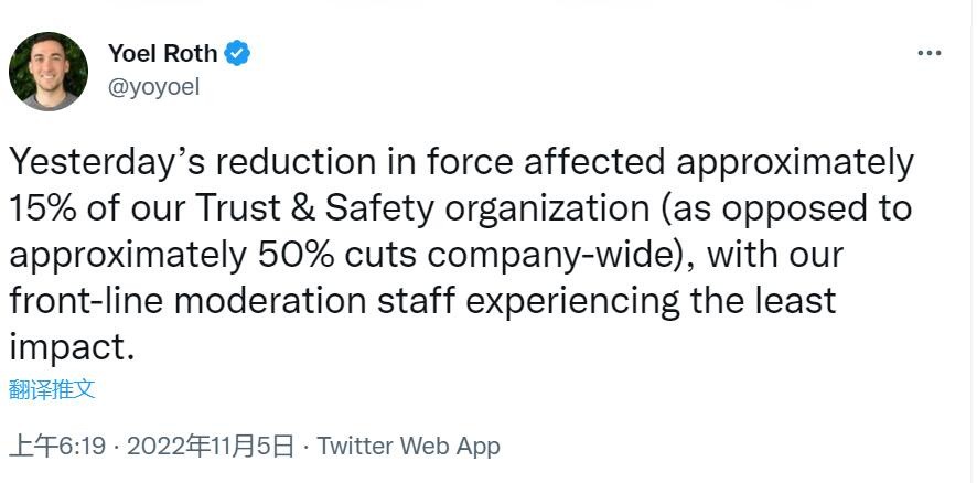 品玩 11 月 5 日訊,據推特的安全與誠信主管 Yoel Roth 表示,推特的臨時大規模裁員對安全審查團隊約 15% 的員工造成了影響。