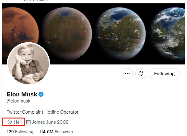上週的某個時候,馬斯克將他在推特上的位置更改為 “地獄”(Hell)。
