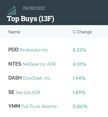 從持倉比例變化來看,前五大買入標的分別是:拼多多 (PDD.US)、網易 (NTES.US)、Doordash(DASH.US)、Sea(SE.US) 以及滿幫 (YMM.US)。