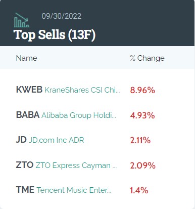 前五大賣出標的包括:KraneShares 中國海外互聯網 ETF(KWEB.US)、阿里巴巴 (BABA.US)、京東 (JD.US)、中通快遞 (ZTO.US)、騰訊音樂 (TME.US)。
