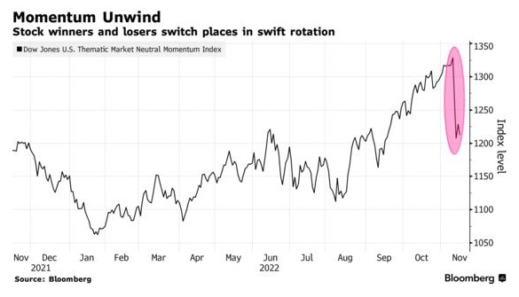 像這樣的轉機在過去的一年裏發生過多次,但都轉瞬即逝。這次最引人注目的是資產間的流動速度。以道瓊斯市場中性動量指數為例,該指數買入表現最好的股票來對抗表現最差的股票。週二下跌 1.5%,將四天的跌幅擴大至 9%,為兩年來最大跌幅。