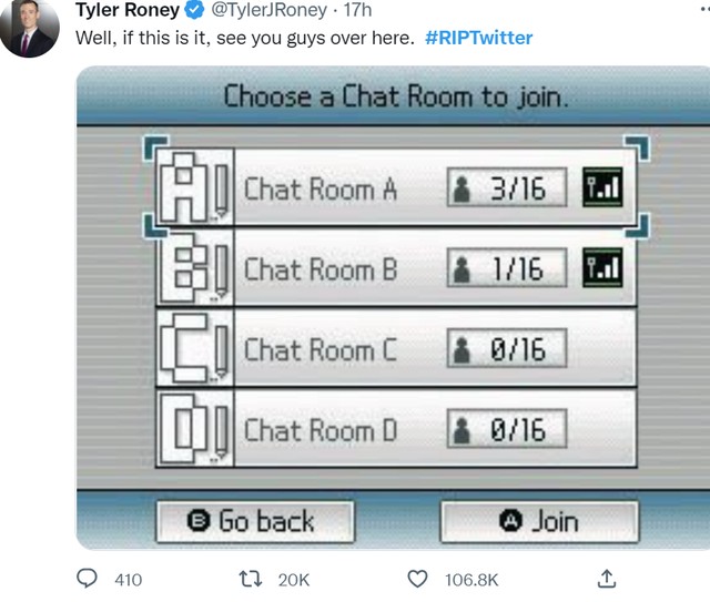 “如果 Twitter 没了,到 PictoChat 上来找我”(任天堂 DS 主机的聊天室功能)