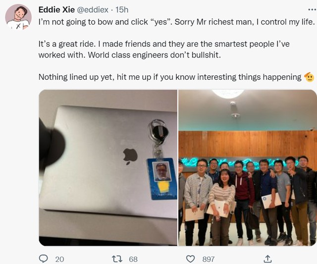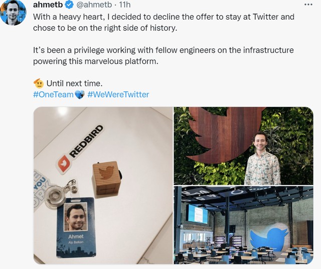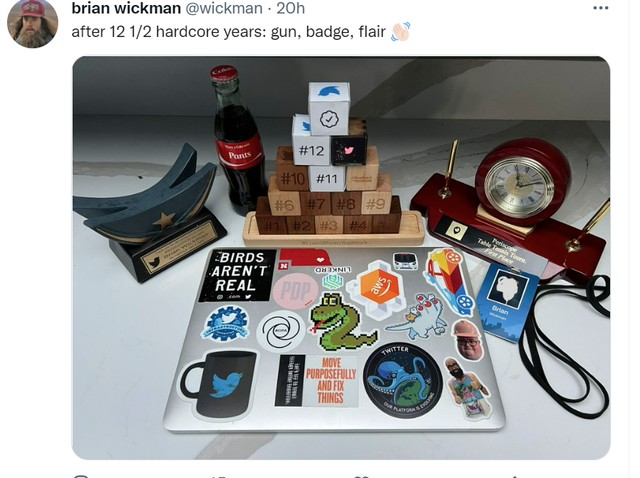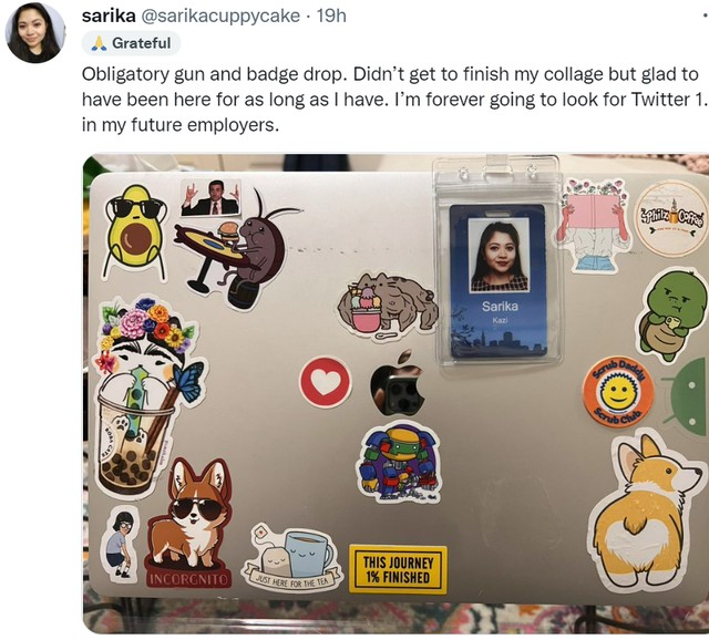这些感言并不长,毕竟 Twitter 还是一个 280 字的社交平台。更多人发了自己的工卡和笔记本电脑的照片,配上一小段话。