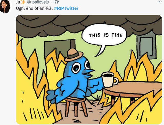 随着越来越来越多的 Twitter 员工宣布自己的离开,不少网友意识到,这事儿可能要闹大了。不少人开玩笑说在这一轮之后 Twitter 就要彻底完蛋了,调侃、笑话和梗图源源不绝冒出来。所以在当晚,#RIPTwitter 这个搞笑话题,一度霸占了 Twitter 热搜榜第一名。