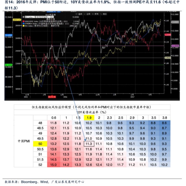 2016年反弹:PMI位于50附近,10Y美债收益率为1.9%,恒指一致预测PE冲高至11.6(略超过中枢11.3)。