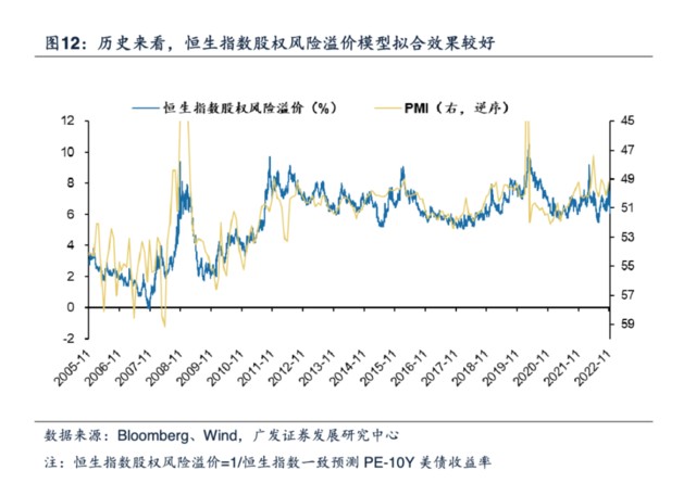 我们在11.13《港股“天亮了”》中谈到,多重底部信号显示港股已经筑底反转。截至2022.11.17,恒生指数距离底部反弹约22.9%,恒生科技反弹30.5%。历史经验显示恒生指数风险溢价模型拟合效果较好,我们可据此测算不同无风险利率和PMI对应下的恒生指数Forward市盈率中枢理论值。