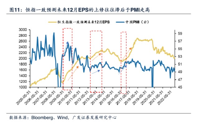 2011年反弹:PMI位于50附近,10Y美债收益率2.3%附近,恒指一致预测PE冲高至10.78(中枢为10.8)。