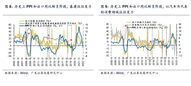 3.基建和促消费政策是对冲经济内生动能下滑趋势的重要抓手。历史来看,国内经济疲弱(PPI和出口增速同时转负阶段),基建投资或促消费政策发力同样是对冲经济内生动能下滑趋势的重要抓手。一方面,基建投资的逆周期属性仍在,若后续防疫政策优化带动消费等经济内生动能恢复,资金投放和项目推进的节奏可能会相应放缓;反之基建则将成为稳定内需的关键抓手;另一方面,汽车往往是促消费政策发力的重点方向,促消费政策发力有望提振内需。