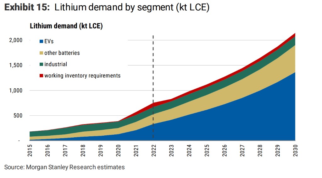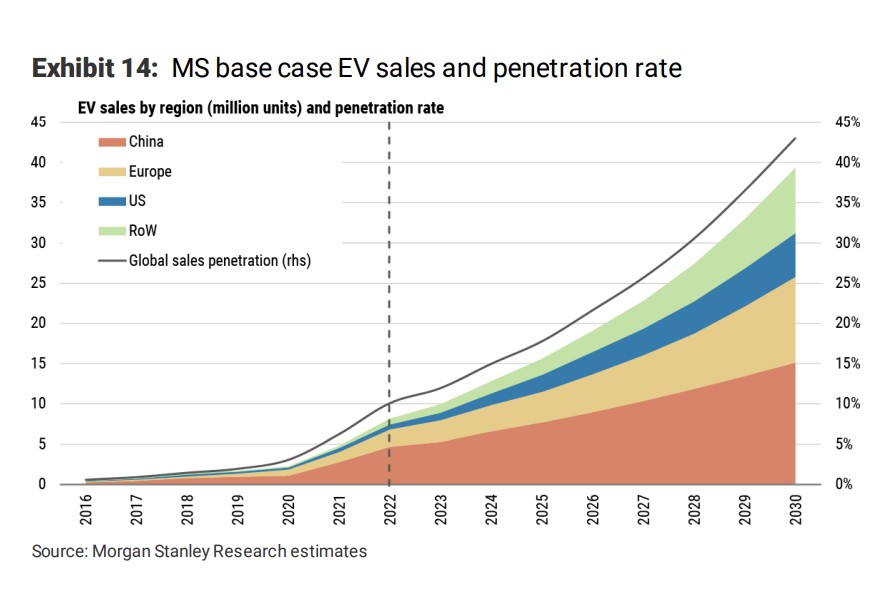 摩根士丹利在報告中強調,儘管他們預計電動車銷售的增長率會在 2023 年可能會放緩,但總銷量將繼續增長。到 2030 年,全球純電汽車滲透率為 43%,同時鋰需求將以 16% 的年複合增長率增長至 2023 報告稱: