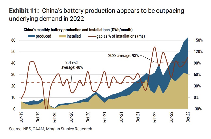 摩根士丹利在報告中指出,中國的電動汽車電池產量存在產能過剩現象,到 2023 年很可能會迎來去庫存週期: