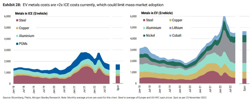為了實現電動車的普及,這需要使其價格比燃油車更有競爭力。但按照目前的鋰現貨價格,一輛 60kWh 的 BEV 將有超過 3000 美元的鋰,這還沒有考慮到與燃油車相比,電動車的其他金屬的使用,這樣的成本差異可能會限制非高端電動車型的廣泛推廣。