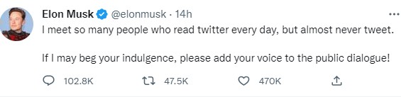同日,馬斯克正在號召更多隻看推不發推的用户多發推文。他在發佈的推文中説: “如果可以的話,請把你的聲音加入到大眾對話中,” 他抱怨説,自己遇到了這麼多人,他們每天都在瀏覽推特,但幾乎從不發推。