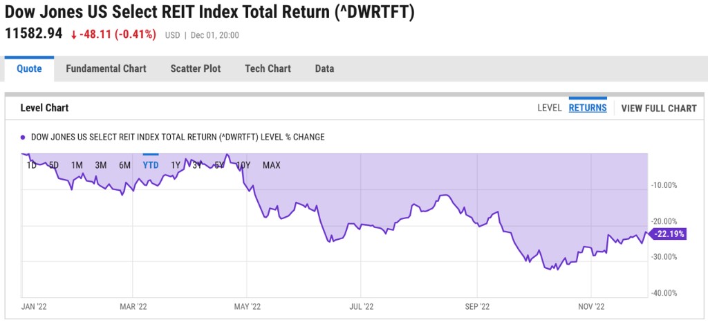 而在美國地產市場走勢低迷的大背景下,道瓊斯美國精選 REIT 總回報指數 (DWRTFT) 同期大跌了 22%。