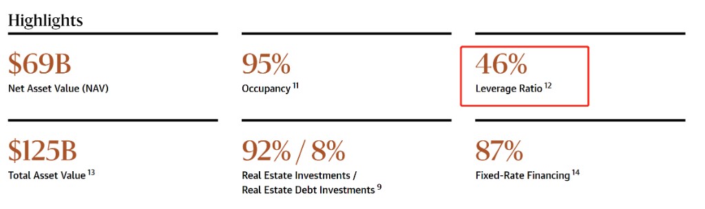 而 BREIT 本身的槓桿水平則不低。截至第三季度末,BREIT 擁有 93 億美元的可用流動資金,但其中只有 14 億美元是現金,其餘的是信貸額度和其他借貸能力。而截至 9 月底,BREIT 的未償債務為 680 億美元,基金槓桿率遠高於 Prologis 等類似的公共房地產投資信託基金。