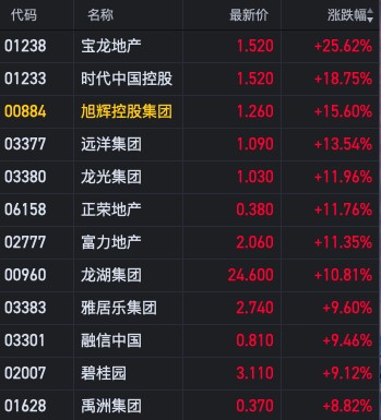 12 月 5 日消息,內房股集體走高,寶龍地產漲近 26%,時代中國漲近 19%,旭輝控股漲近 16%,遠洋集團漲近 14%。
