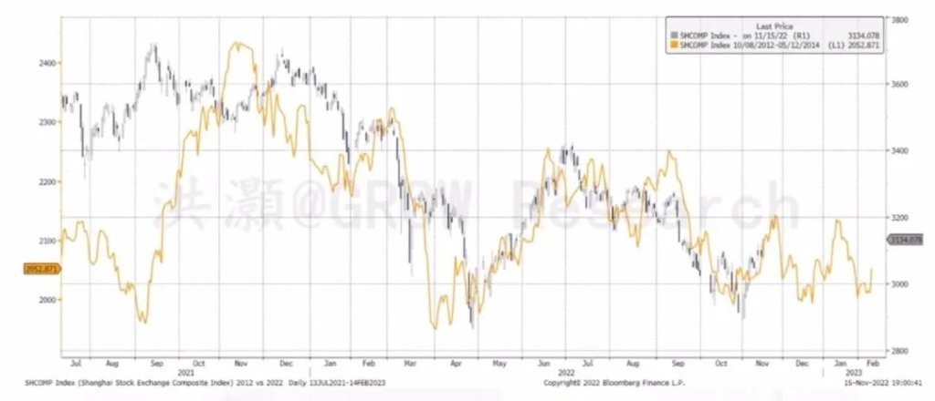截止 11 月 15 號的走勢,(二者)基本上非常接近,前面 2021 年這一段稍微有一些偏離,但它運行的方向是一致的。如果這樣就要想一下,為什麼我們現在看到的市場走勢,跟 2013、2014 年的走勢有很大的雷同?