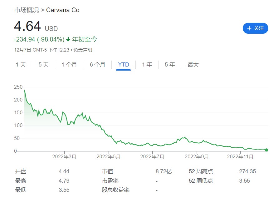 Carvana 股票自 2017 年上市以來首次跌破每股 5 美元后,於週三上午短暫停牌。停牌解除後,該股一度跌破每股 4 美元。 在去年 8 月 10 日創下 376.83 美元的歷史盤中高點後,Carvana 的股價今年已暴跌約 98%。