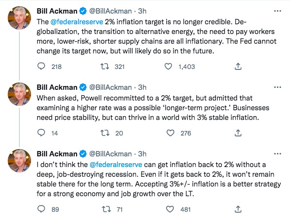 美國對沖基金大佬、潘興廣場資本管理公司創始人比爾·阿克曼 (Bill Ackman) 也認為,美聯儲 2% 的通脹目標變得不再可信: