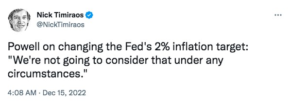 在新聞發佈會上,鮑威爾駁斥了在可預見的未來任何時候重新考慮 2% 通脹目標的任何想法。但他含蓄地保留了在未來重新審視目標的可能性——也許是在 2025 年左右結束的下一次 “框架審查” 時,或者可能是之後的一次。換句話説,直到很久以後。