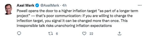 Merk Investments 投資主管 Axel Merk 稱,作為 “長期工程” 的一部分,鮑威爾打開了通向更高通脹目標的大門。Merk 同時抨擊鮑威爾溝通不暢: