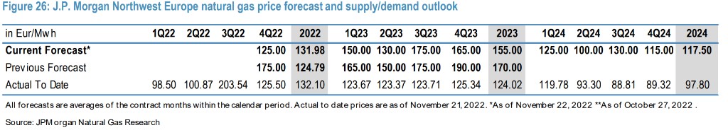 同時,小摩認為,如果明年沒有極端天氣的干擾,西北天然氣公司可以完成 43% 的冬季補給。預測其 2023 年天然氣的均價為 155 歐元/兆瓦時,比 2022 年的 131 歐元/兆瓦時有所上漲,2024 年天然氣的均價為 117.5 歐元/兆瓦時。