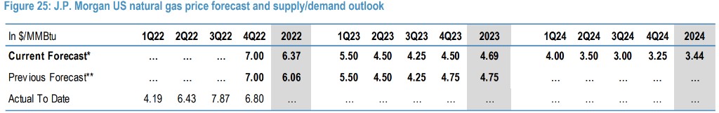 對於天然氣的價格,摩根大通認為 2022 年的天然氣產量將會對 2023 年天然氣的價格產生一定限制,預計 2023 年天然氣的平均價格將由 2022 年的平均 6.37 美元/百萬英熱,回落至 4.69 美元/百萬英熱。