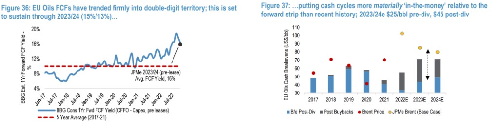 對於歐洲的油價,小摩認為歐盟主要經濟體在 2023 年將會產生最具吸引力的風險回報比,同時成品油留存的現金利潤(FCF)也將繼續維持在兩位數,與美國的差距將逐步縮小。