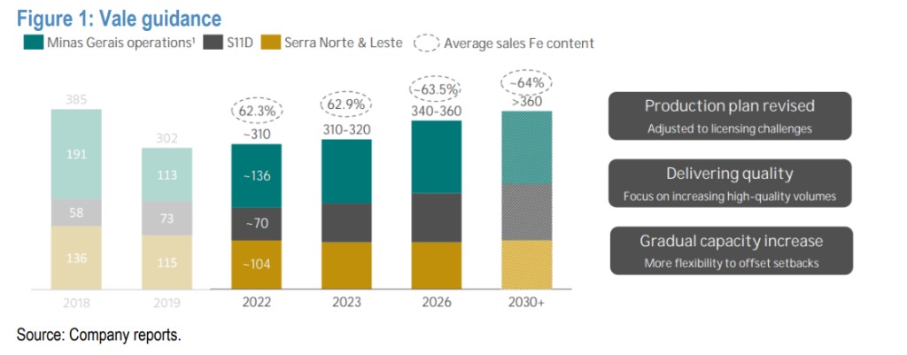 淡水河谷下調產能預期後,我們也修改了供應假設。淡水河谷對 2023 年的鋼鐵產量指引為 3.1-3.2 億噸(同比持平)。這低於我們先前估計的 3.3 億噸,也低於共識。此外,淡水河谷將至 2026 年的長期目標已從 3.95 億噸下調至 3.6 億噸。RIO 也表示 2023 年的產量與去年持平,為 3.2-3.35 億噸。