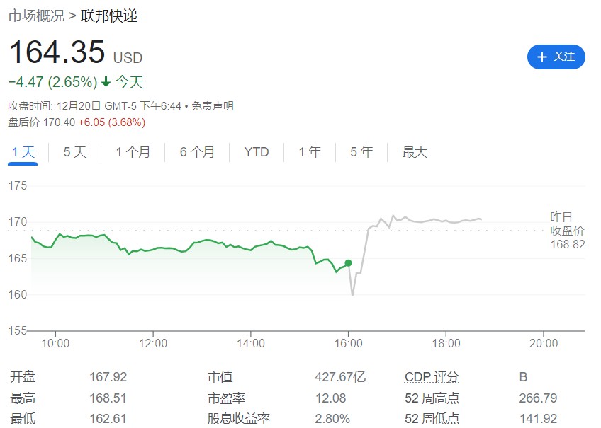 在週二的盤後交易中,聯邦快遞股價先跌後漲,當前漲幅約為 3.7%。