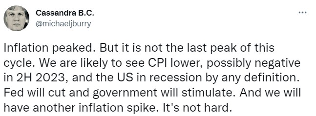 Burry 預計美國衰退已成定局,而美聯儲將選擇降息來刺激經濟,從導致通脹再度飆升。他在推文中表示: