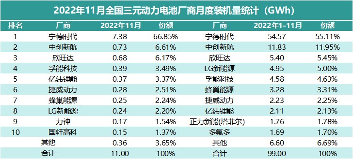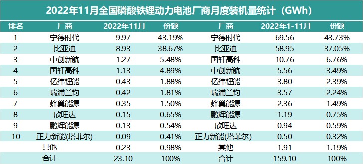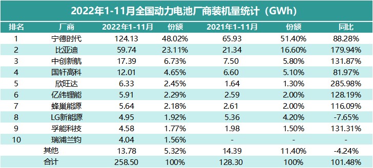 與 2021 年的榜單相比,前四名位置並未發生變化,寧德時代、比亞迪、中創新航、國軒高科的地位穩定,比亞迪與寧德時代相比,份額差距有所縮小。