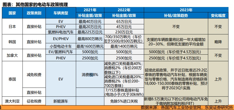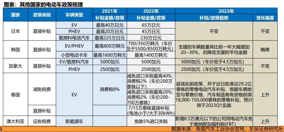 而以泰國、韓國等為例的亞太地區國家,2023 年還將延續優惠政策。其中,泰國宣佈 23 年新推出 29.2 億泰銖車企補貼,以推動本土電動車製造業,電動汽車製造商有資格獲得 1.8-15 萬泰銖的零售補貼;澳大利亞 2023 年免除福利税和進口關税;日本延續 2022 年以來的直接補貼政策,且相比 2021 年呈上漲趨勢;韓國補貼出現小幅下降。