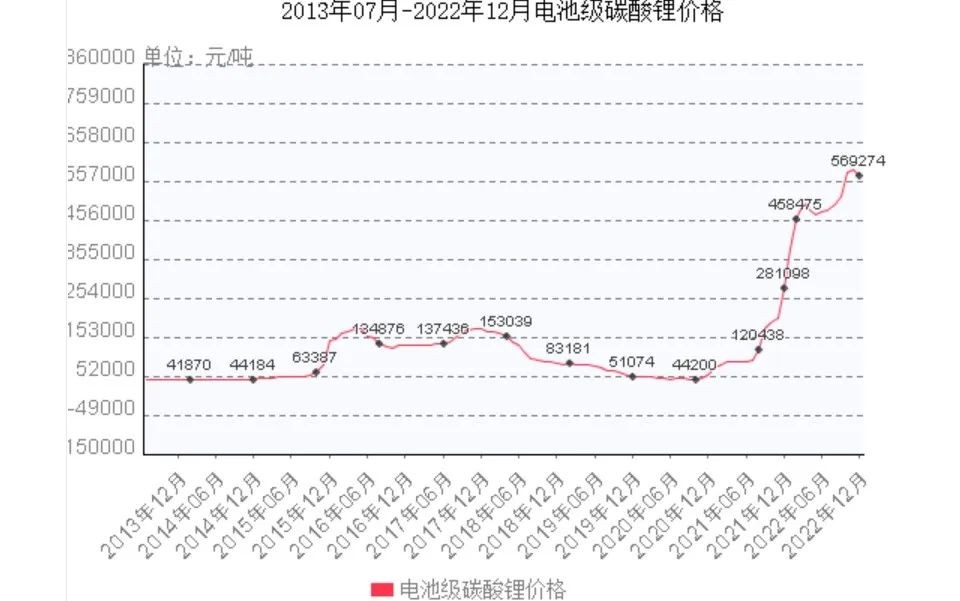 也就是説,與 2020 年相比,電池級碳酸鋰價格在兩年內暴漲逾十倍。