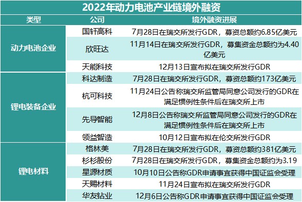 據不完全統計,目前成功在海外通過發行 CDR(存託憑證)成功上市的包括國軒高科、欣旺達兩家電池企業,此外還有材料和裝備企業格林美、杉杉股份和科達製造。