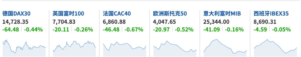 歐股開盤普跌,隨後保持弱勢震盪,截止目前,英國富時 100 指數跌 0.26%,歐洲斯托克 50 指數跌 0.52%,德國 DAX30 指數跌 0.44%,法國 CAC40 指數跌 0.67%。