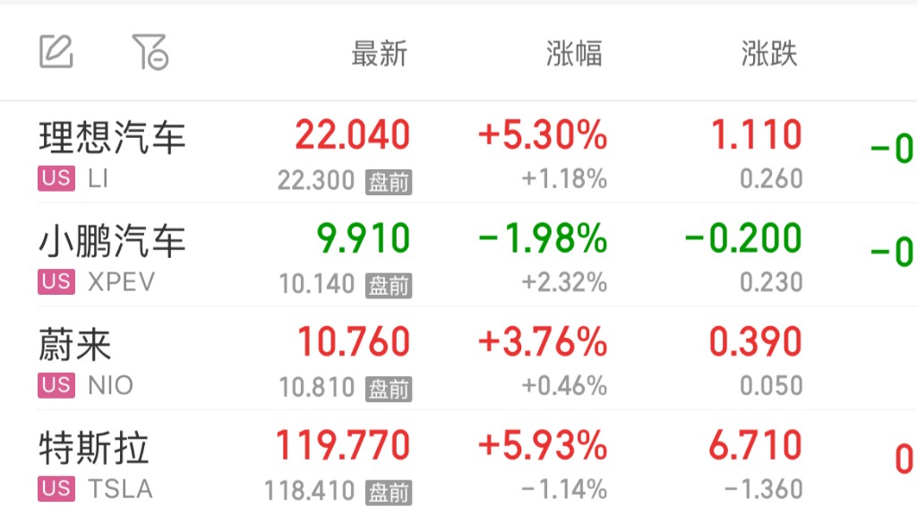 其他個股和板塊方面,美股新能源汽車股盤前普漲,理想汽車一度漲 3.5%,小鵬汽車一度漲近 4%,特斯拉跌超 1%。