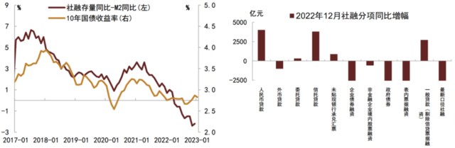 圖表 3:社融-M2 同比差值與 10 年國債收益率(左);12 月社融同比多增情況(右)
