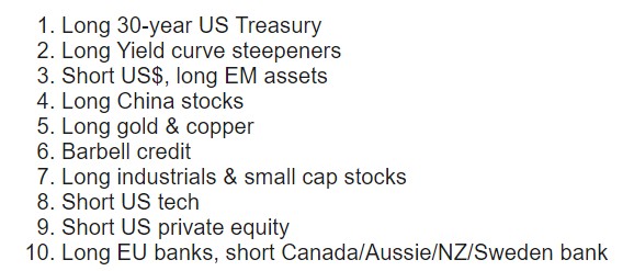 但 Hartnett 認為,在利率、科技股、股票回購、能源、戰爭和美元,以及全球地位等因素的共同作用下,全球股市將在 2023 年跑贏美股。在其 “年度十大交易”(圖 2)中,Hartnett 看多中國股市、歐洲銀行股,看空美國科技股。