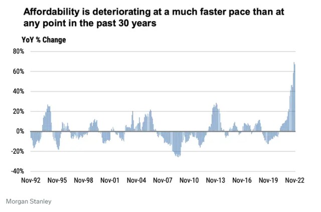 回顧 2022 年,由於抵押貸款利率持續飆升,全年漲幅創歷年來最高水平。按照摩根士丹利分析師 James Egan 等人的觀點,借貸成本高漲疊加房價仍處於歷史高位,導致 “民眾房屋購買力以三十年來最快的速度下滑”,並且 “在此期間,房貸月供佔家庭收入的比例同比大漲一倍多”,許多潛在購買者被迫離場觀望。