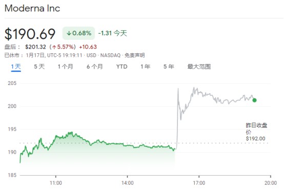 受此消息刺激,Moderna 隔夜美股盤後一度大漲近 7%,股價重回 200 美元上方。