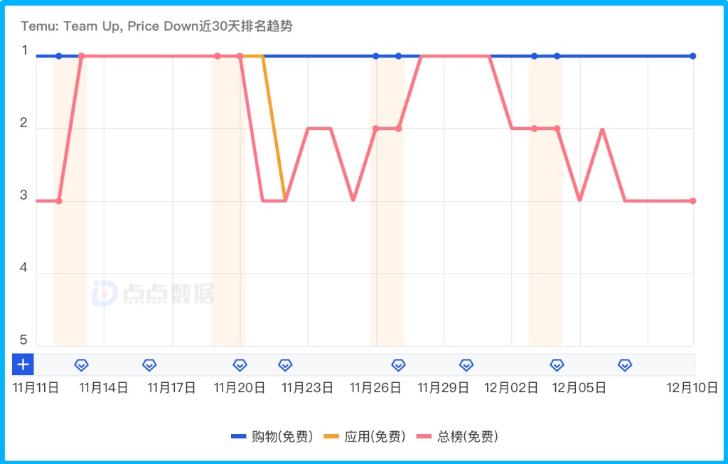 Temu 也成為繼 SHEIN、TikTok 後又一個在美國市場引發關注的應用平台,一度超越亞馬遜、沃爾瑪等應用,登上美國 App Store 免費購物應用榜第一的位置;在 11 月 11 日-12 月 10 日期間更是未跌出過美國 App Store 免費總榜前三,且多次位列第一。